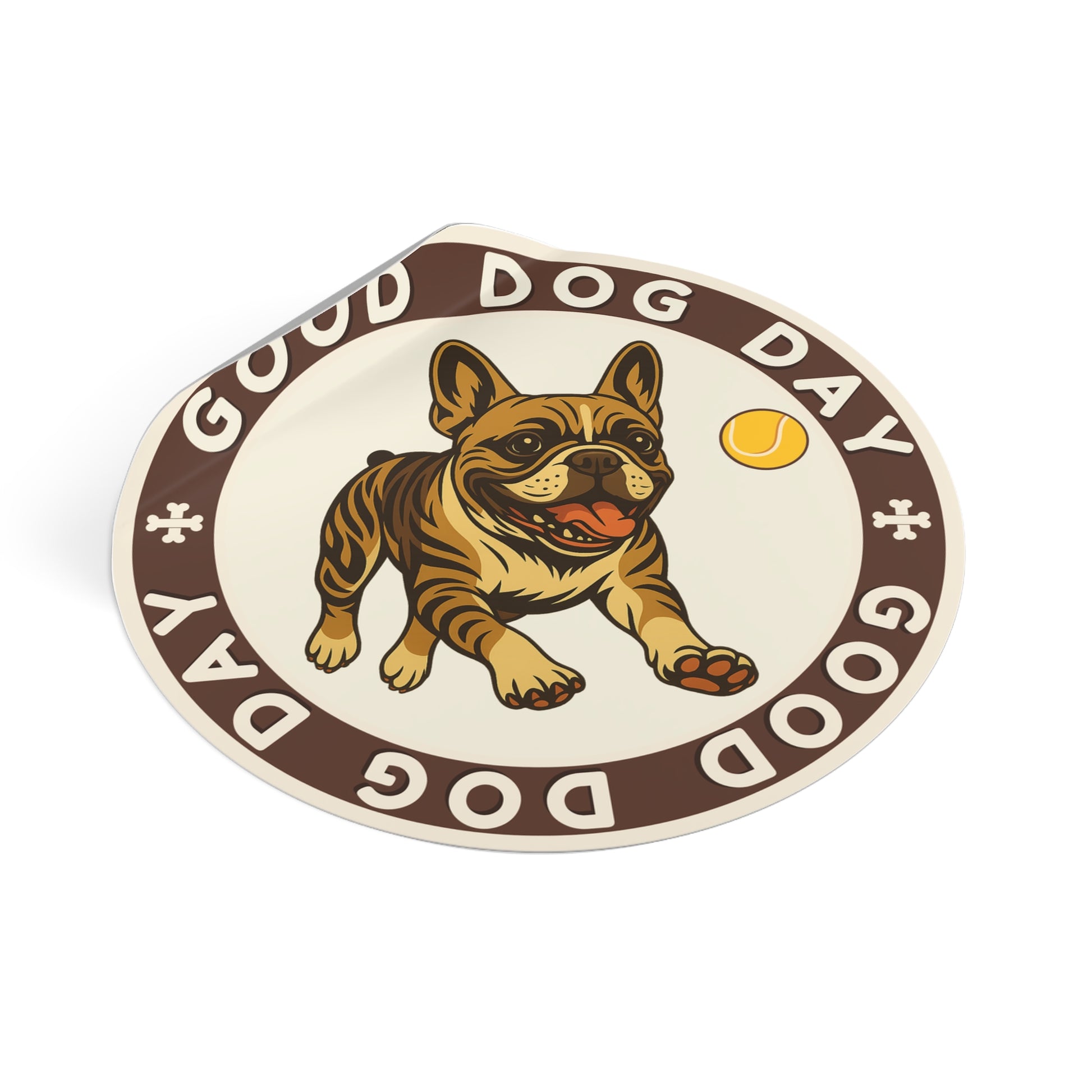 The Good Dog Day French Bulldog 3"x3" Sticker– Brown Sugar & Cream brings the bounce. This pumped-up little tank is mid-stride, tongue out and eyes locked on the ball. It’s all ears, paws, and joy, framed in the classic GOOD DOG DAY ring with just enough motion to make it feel alive.