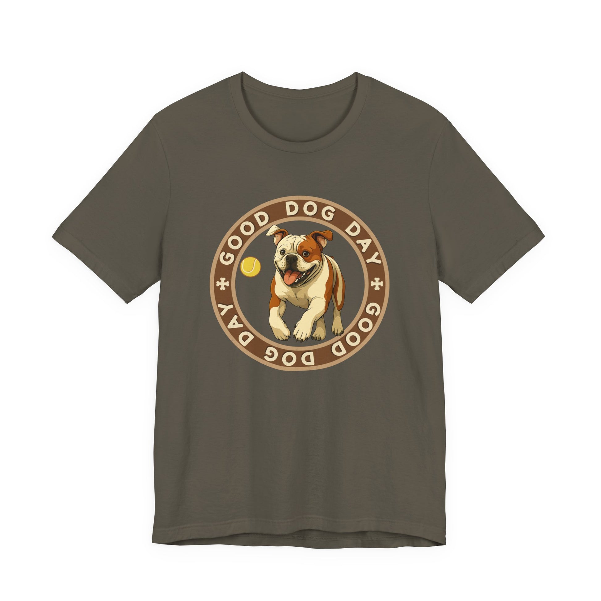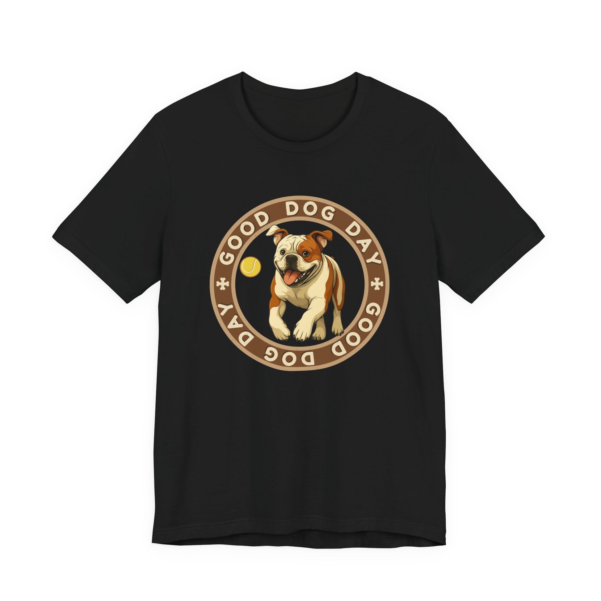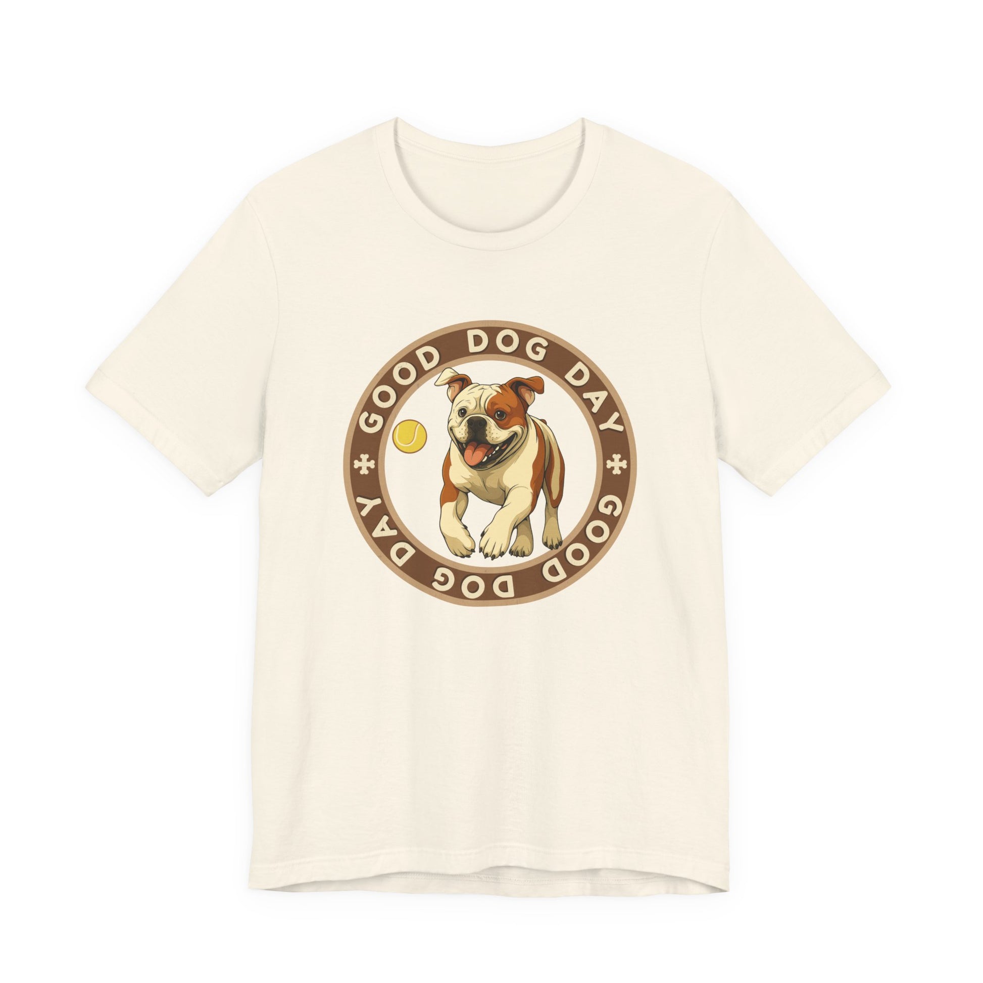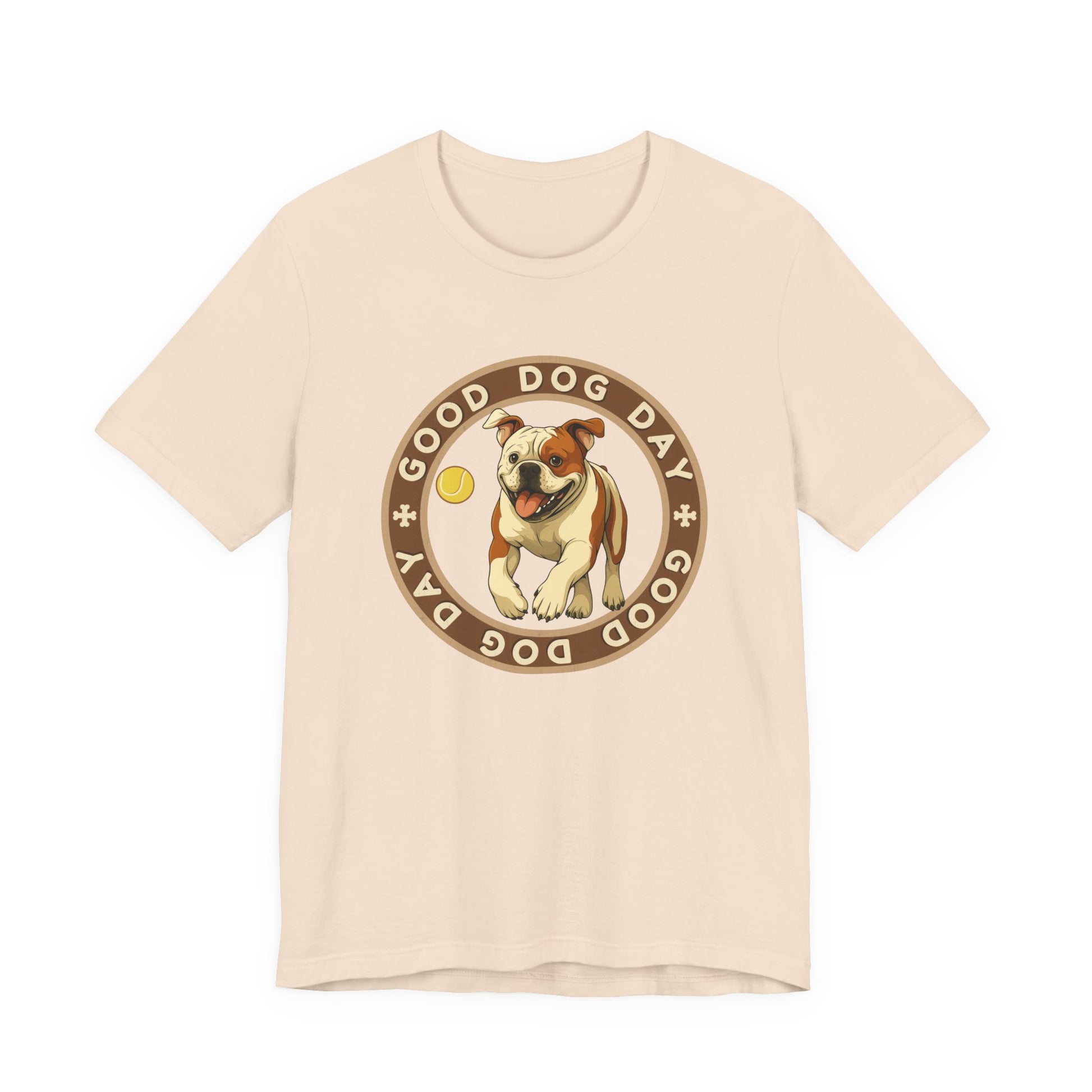 Features a joyful bulldog mid-stride, tongue out and eyes locked on the ball, framed in the classic GOOD DOG DAY ring. With a warm cream coat and rich rust-toned patches, this compact powerhouse is all muscle, motion, and charm — built to move and guaranteed to make you smile. Inspired by vintage screenprint posters, it celebrates momentum, personality, and the pure joy of a good dog day.