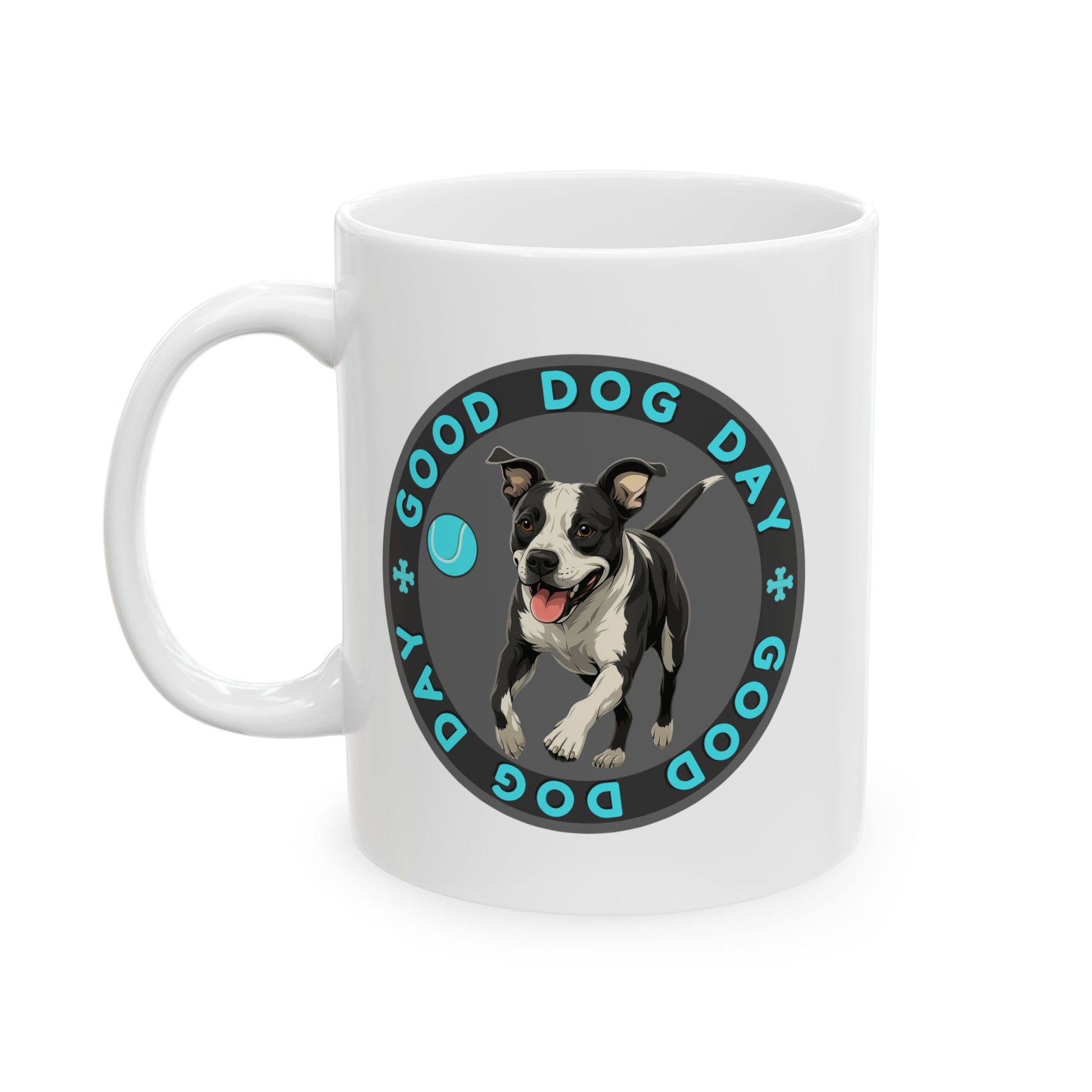 The Good Dog Day Pit Bull Mug – Dark Mode locks in the joy mid-stride. This athletic sweetheart is all bounce and power, framed in the signature GOOD DOG DAY ring and racing toward the next moment of play. Wrapped in rich color on glossy ceramic. Feels good in your hand. Plays nice with your microwave. Never complains about the dishwasher.